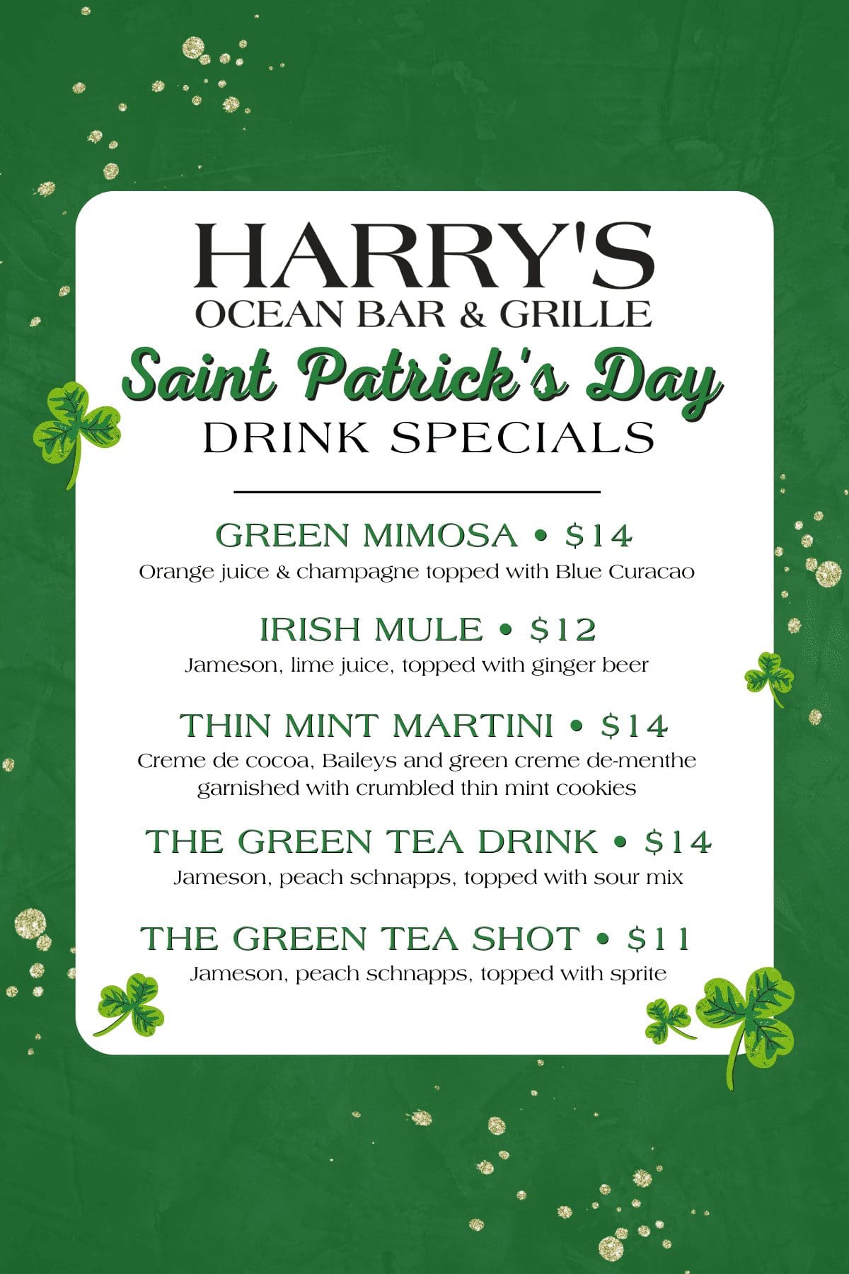 Join us Friday, March 17th for our 2nd annual celebration featuring Jameson Irish Whiskey with giveaways, contests, and specialty cocktails. The party begins at Harry’s Ocean Bar & Grille, at 3 PM with Irish-inspired food & drink specials, new Harry’s menu items, and live music from 4-8 PM! Don’t forget to wear green.